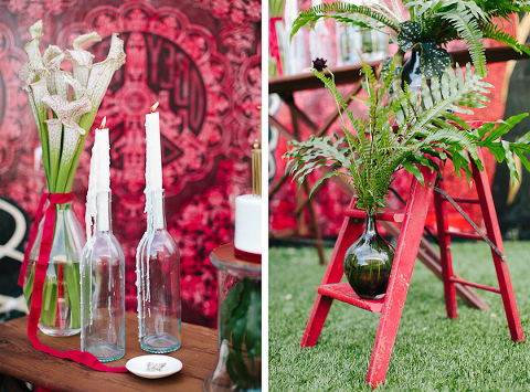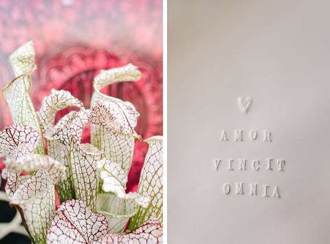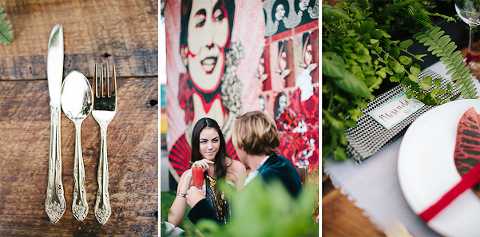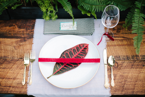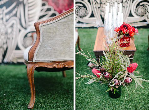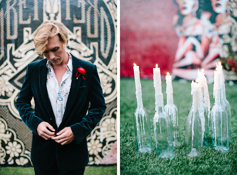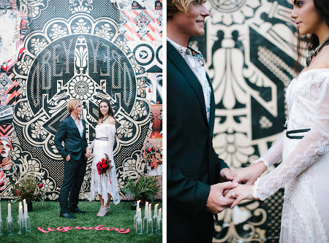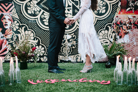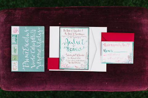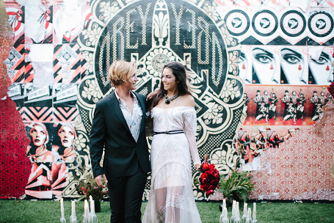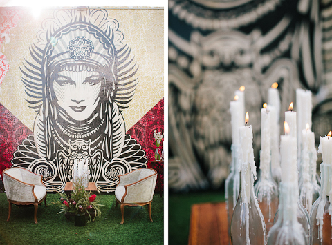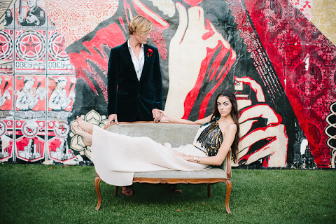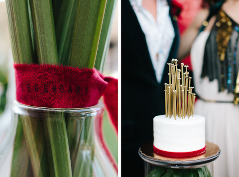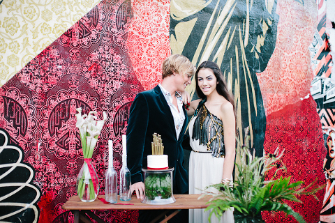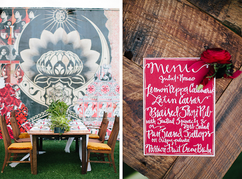 As one of the greatest love stories of all time, Romeo and Juliet has been the inspiration for many songs, movies, and other art pieces throughout the years. However, the 1996 version with Leonardo DiCaprio and Claire Danes often stands out as one of the most beautiful renditions for its blend of modern and classic, with an amazing graphic quality and the juxtaposition of bold modern scenery with this classic story of true love. It was these qualities that inspired Miranda ( Sugar(ed) Occasions) to dream up a wedding based on the innocence and passion of young love in a strikingly contemporary setting. I love the custom ribbon with the phrase “A Legendary Love” carried throughout, and the golden spikes placed on the cake and throughout the centerpiece that she made herself. She has such a creative mind, and I’m so happy I was able to photograph it. So many other vendors contributed to this shoot and were so wonderful to work with. Unearthed Vintage provided all the gorgeous furniture (check out all of their beautiful pieces), the invitation suite was handmade by MakeWells using watercolor and ink, the girls of Hot Pink Style took care of all the hair/makeup/styling, and the Wynwood Walls/Wynwood Kitchen was the absolute perfect setting for this theme!